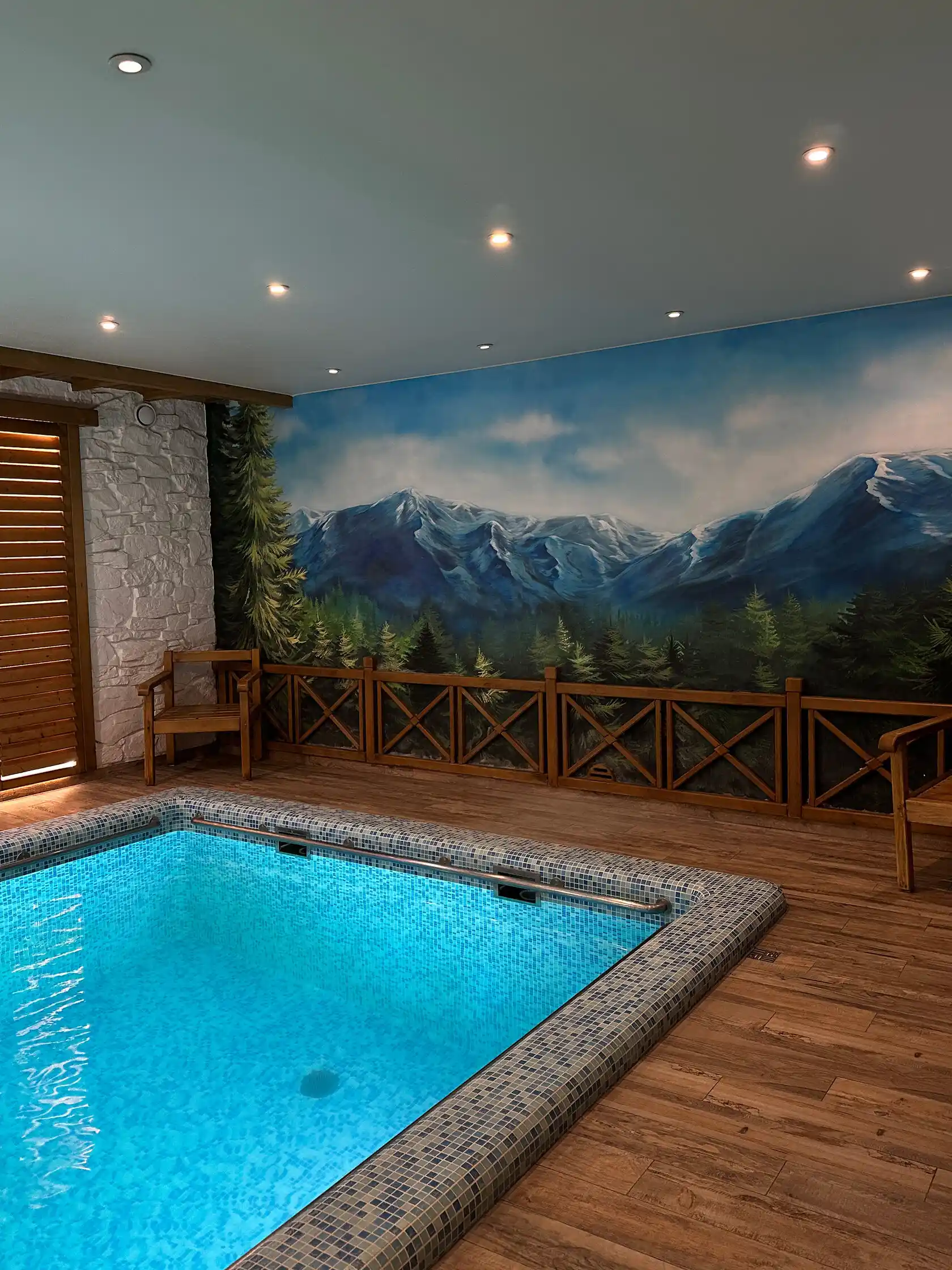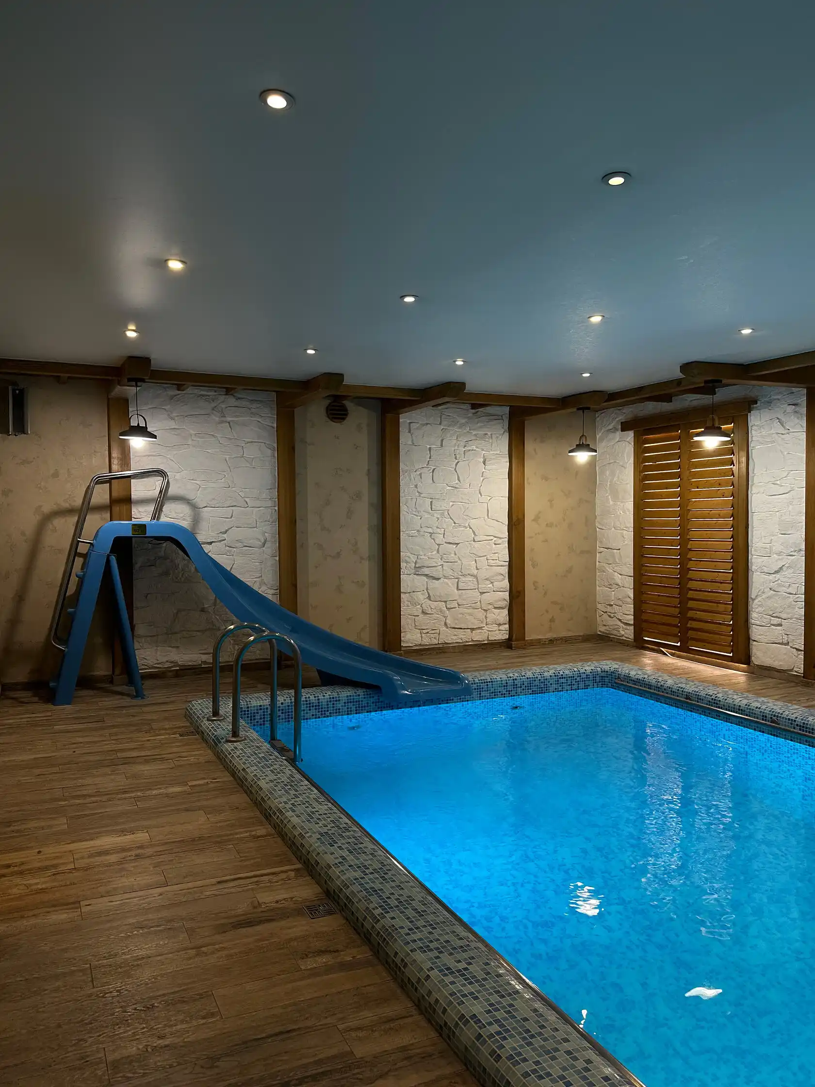 Просторная и светлая сауна с мягким микроклиматом. Горячий воздух от раскалённых камней прогревает всё тело. Полное расслабление и прилив энергии в массажной зоне. Для детей предусмотрены горка, надувные круги и игрушки